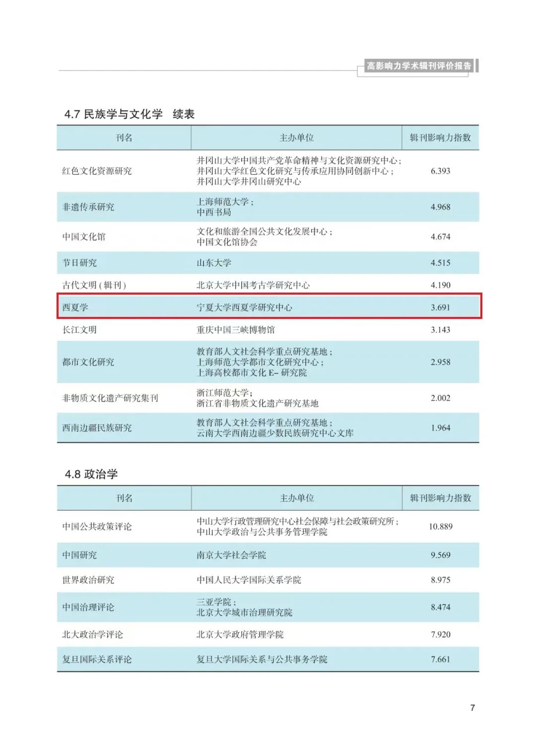 该报告将辑刊分为18个学科领域。其中,宁夏大学西夏学研究院主办的《西夏学》在“民族学与文化学”中位列第九,辑刊影响力指数3.691。